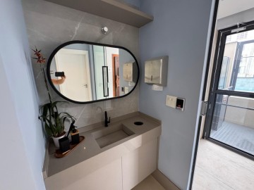 Apartamento com 03 suítes, living, lavabo, churrasqueira a carvão, 2 vagas de garagem, o apartamento possui 115m² privativos e 187m² de área total.